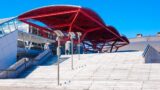 幕張メッセの特徴的な赤い屋根と大階段の外観